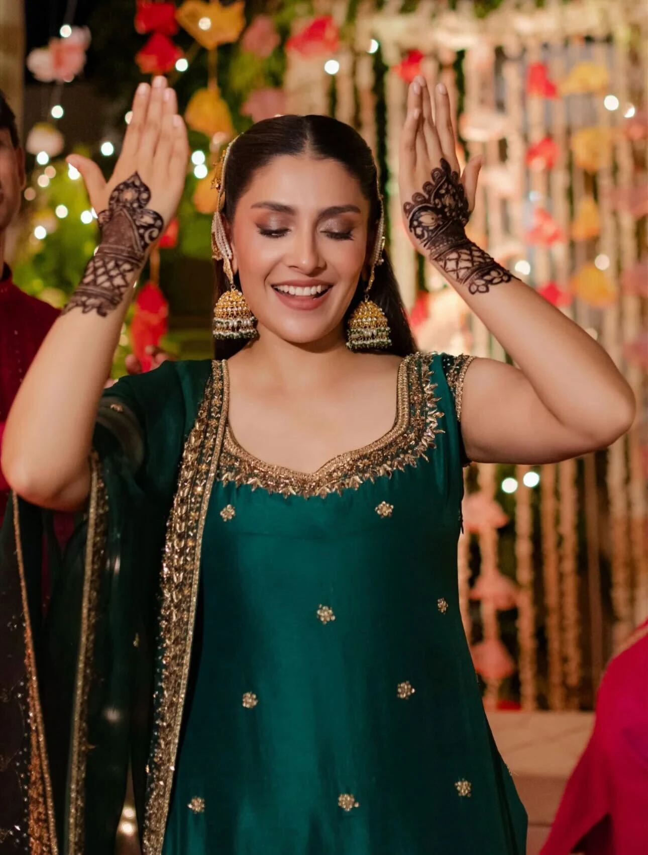 Light, bright outfits—especially greens—such as lehengas, shararas, or printed saris.