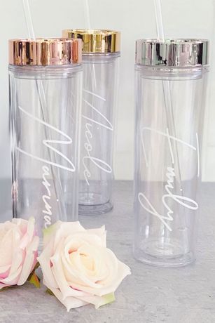 A perfect gift for bridesmaids and more, this personalized tumbler features a metallic straw lid and the name of your choice in white vinyl script.