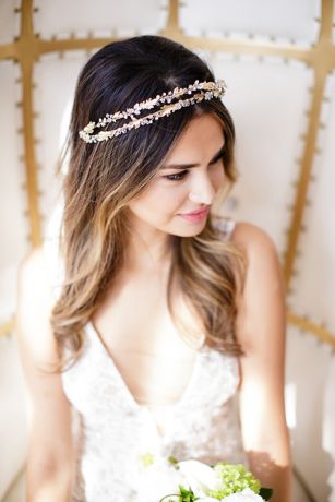Crafted of 14k gold leaves and dainty crystals buds, this Grecian-inspired halo can be worn as both a sash and headband.