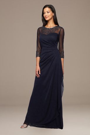 Aglow with tonal beading at the illusion neckline and three-quarter sleeves, this ruched mesh petite A-line dress makes an elegant impression.
