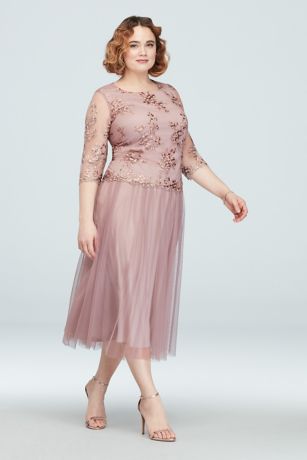 Detailed with lustrous embroidery, illusion three-quarter sleeves, and a tea-length tulle skirt, this plus-size dress is simply stunning.
