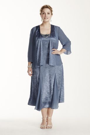 - Sleeveless tea length dress with beaded square neckline features godet detailing in skirt.