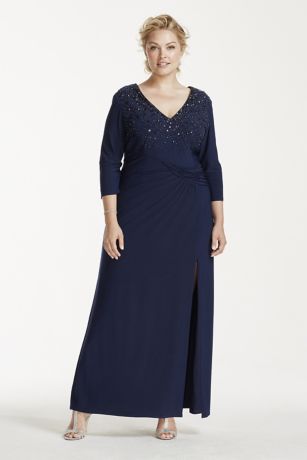 - Long soft jersey with ruched waist and side slit make this a comfortable evening gown.