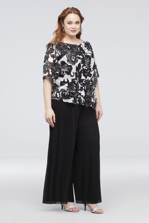 Topped with a bold floral burnout print and finished with a fashion-forward asymmetrical hem, this plus size scoopneck top pairs beautifully with our skirt and pants separates.