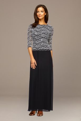 This classic sequin lace and chiffon two-piece gown features easy-to-wear 3/4-sleeves and a soft, flowing skirt.