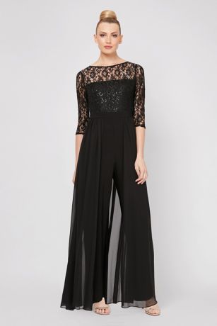 Step into style in this flowy wide-leg jumpsuit, featuring three-quarter sleeves, a sheer yoke, and a sparkling sequin lace bodice.