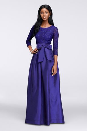 Fit for a royal affair, this spectacular taffeta ball gown features an exquisite lace bodice with sheer three-quarter lace sleeves and a full taffeta skirt with wide sash.