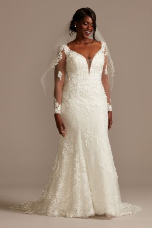 3D Floral Illusion Sleeve Plunge Wedding Dress