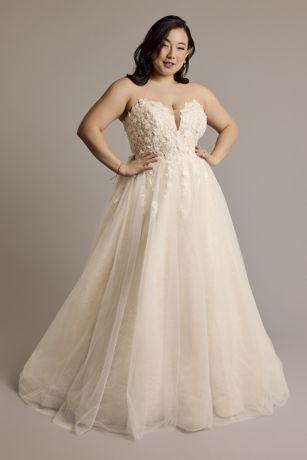 You'll look ethereal in this 3D floral tulle ball gown. Delicate flowers adorn the strapless bodice and flowy skirt, while a plunging neckline adds allure. With included swag sleeves, you can customize the gown to make it your own. Plus, it has pockets!