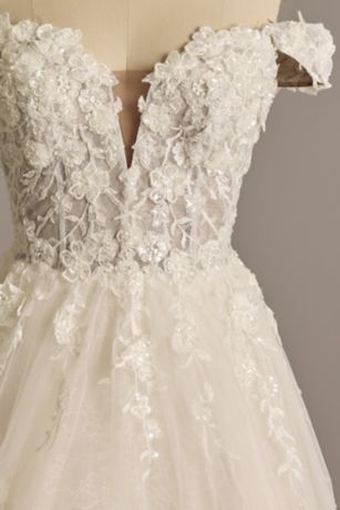You'll look ethereal in this 3D floral tulle ball gown. Delicate flowers adorn the strapless bodice and flowy skirt, while a plunging neckline adds allure. With included swag sleeves, you can customize the gown to make it your own. Plus, it has pockets!