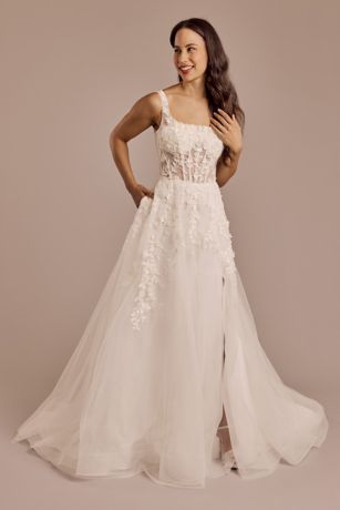 This square neck wedding dress shines with 3D floral appliques for everlasting bridal romance. The sheer bodice and tank sleeves combine for an added flair, while a flirty skirt slit brings a touch of drama and movement.