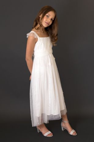 She'll be a vision of loveliness in this soft tulle girls dress. 3D flowers, pearl embellishments and flutter sleeves add extra-special details.