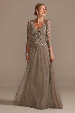 Sparkle and shine in this mesh A-line dress featuring a flowy pleated skirt and gorgeous beading on the bodice and three-quarter illusion sleeves.