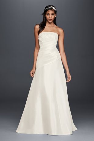 A drop waist is the perfect addition to the classic A-line silhouette on this satin wedding dress since it elongates and flatters in all the right places. Designed with a beaded embellishment at the hip for a touch of texture and shine.