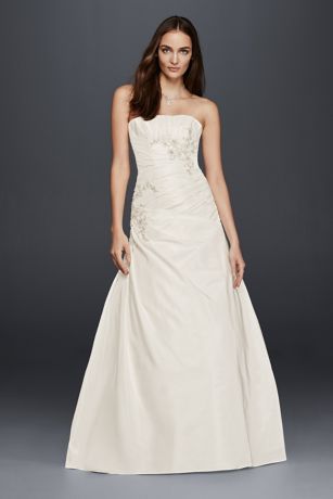 Expertly crafted to make you feel every bit the beautiful bride, this strapless A-line wedding dress takes a modern (and flattering) approach to a classic look. By pairing richly beaded appliques with a ruched bodice, this dress highlights your figure with dimensional details.