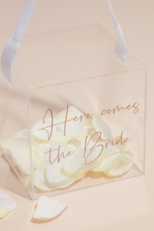Ultra-modern yet romantic, this flower girl basket prominently puts petals on display with its cool acrylic, see-through sides. Reads "here comes the bride" in sweet script.
