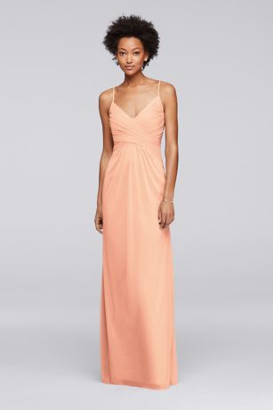 Adjustable spaghetti straps crisscross in the back of this mesh long bridesmaid dress with a waist-flattering ruched bodice.