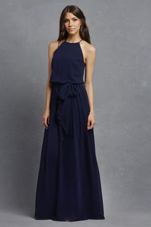 This chiffon bridesmaid dress is beautifully simple. The high-neck blouson bodice gives way to a full and flowing skirt, and a matching sash ties the whole look together.