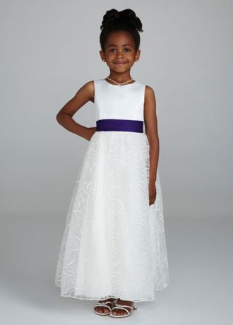 Tank satin bodice with satin bow at waist. All-over lace beaded embroidered rose print skirt. Available in stores and online White. Shown with satin sash S1041, sold separately. Sash is available in the 40 color palette listed below.