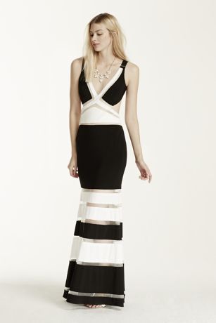 - Jersey dress features sultry, illusion mesh bands throughout the bodice and skirt for a truly unique and modern look.