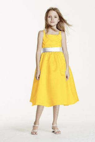 All-over satin tea-length ball gown featuring bodice with wide spaghetti straps.