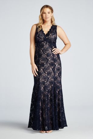 A must-have, timely dress for your favorite special occasion! Sleeveless, all-over sequined lace dress with open back and satin sash that ties at back featuring a floor length skirt with complementing godets. Plunging v-neck with scalloped edges make this dress both fun and flirty.