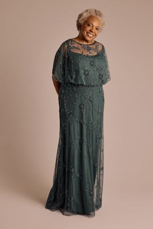 Dazzling and romantic, this A-line dress showcases allover beading and soft blouson sleeves for a sophisticated mother of the bride or groom style.