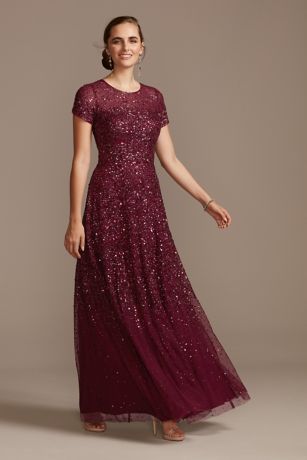 Allover Beaded Mesh Overlay Short Sleeve Dress