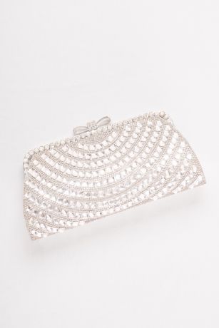 Glittering rhinestones and a sleek bow closure add deco-inspired flash to this glam clutch.