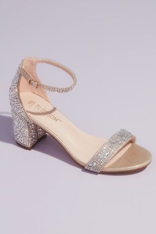 These stunning block heel sandals are perfect accessory for adding a touch of glamour to any special occasion. The allover crystal glitter design sparkles and shines with every step, making them a show-stopping choice for weddings, proms, or any formal event. The block heel provides added stability and comfort, so you can dance the night away without any worries. Pair them with a beautiful gown or cocktail dress for a look that is sure to turn heads. Make a statement with these dazzling sandals from David's Bridal.