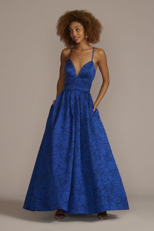 Make a gorgeous impression in this floral printed ball gown featuring wrap-around ties that highlight your waist and handy hidden pockets.