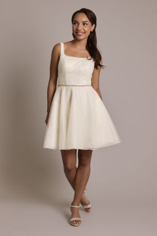 A moment for the dress, please! This allover glitter A-line catches every eye (and light!) in the room, complete with a trending square neckline and rhinestone embellished belt.