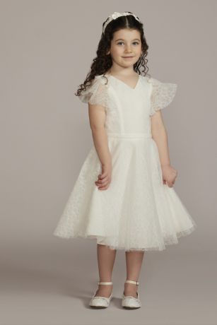 Five layers of fabric and over a yard and a half of lace create this fluttery tea-length flower girl dress. The delicate illusion back featuring scalloped lace balances the sweet flutter sleeves and full skirt.