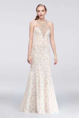 The eye-popping crystal neckline of this allover lace mermaid gown provides the perfect amount of bling. This style is exclusive to David's Bridal.