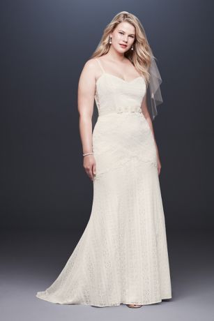 Thoughtfully placed appliques at the waist, hips, and back make this linear lace sheath wedding dress ultra-flattering. Panels at the sides feature illusion lace-up panels for a subtly sexy touch.