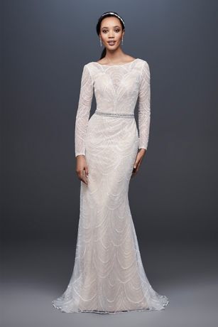 This beaded sheath wedding dress combines a simple silhouette with statement embellishments. A scalloped pattern gleams with iridescent sequins, and more than 5,000 hand-sewn crystals and sequins adorn the waistband.