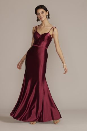 Make sure to schedule time to walk the red carpet once you've got this stretch satin sheath gown on. A corset bodice accentuates your figure, while shoulder ties add a youthful touch. Pair with your best heels, and wear to prom or any dressy affair.