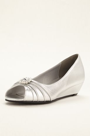 - Low wedge peep toe pump features pleats on the vamp, accented by a high-shine broach.