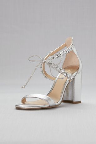 With a simple band at the toe and a chunky block heel, these sandals shine with crystal beading at the tied ankle straps.