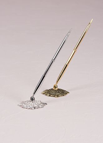 Filigree antique inspired styling makes this base with coordinating pen a beautiful option for your guest book table. Choose gold or silver.
