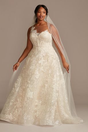 This corseted wedding dress features a luxurious lace applique that creates an asymmetric, contemporary neckline at the front and highlights a crystal-embellished button illusion back. The rich applique design trails down bodice and cascades atop layers of shimmering beaded and sequin lace, lending an opulent, luminous effect. Complete with a sweep train.