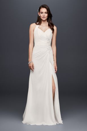 Cascading chiffon, gathered side pleating, and a beaded floral lace applique glam up this halter sheath wedding dress. Long ties at the nape add sweeping elegance.