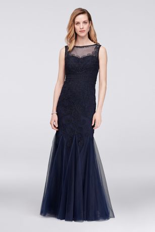 Ornate filigree appliques and a stunning, flared-tulle skirt make this illusion tank gown a sophisticated choice.