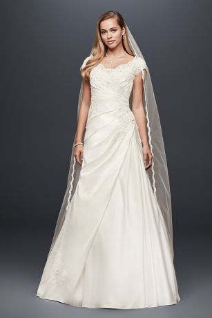 Gently scalloped beaded lace appliques form the neckline, cap sleeves, and bodice detail of this gathered satin wedding dress. The plus-size A-line silhouette is finished with covered buttons and graceful pleating at the back.