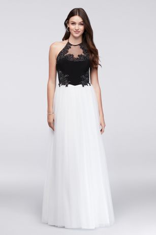 It's a blast to dance the night away in an airy tulle skirt. Paired with a sparkle-appliqued halter bodice, this ball gown is so fun for prom.