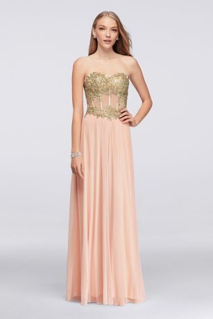 Ready to turn heads? This is the dress. The long jersey gown is richly appliqued with gold lace, and features a corset-style, sheer illusion bodice complete with boning for structure. This style is exclusive to David's Bridal.