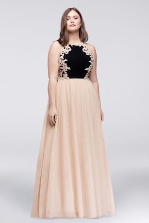 Corded lace appliques, studded with tiny crystals, add sparkling detail to the high-neck jersey bodice of this tulle ball gown.