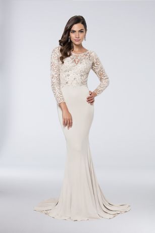 Appliqued Long Sleeve Matte Jersey Sheath Gown