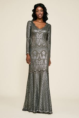 Light-catching sequins in baroque and geometrical lattice patterns cover this long-sleeve sheath gown from top to bottom. A scalloped V-neck adds a feminine finish.