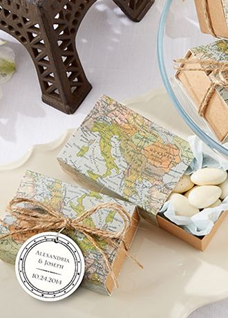 • Travel-inspiring favor box with map-print cover and vintage, kraft slide-drawer, all tied with a double, natural-twine bow